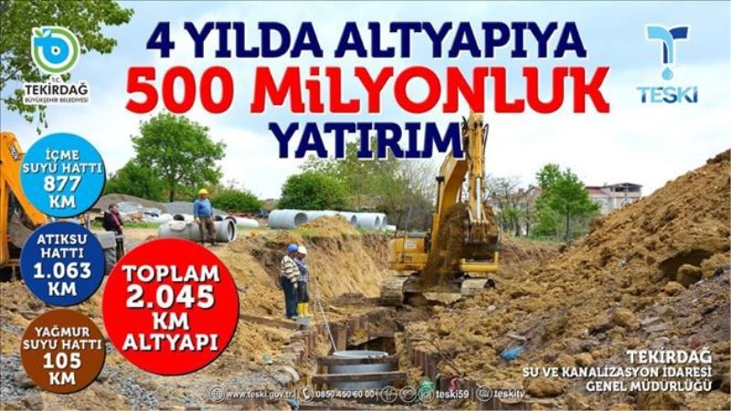 Teski Tekirdağ genelinde oldukça önemli projeleri hayata geçirdi. 877 kilometre içme suyu, 1.063 kilometre atıksu ve 105 kilometre yağmur suyu altyapı imalatı yaptı. Tekirdağ 2.045 kilometre sağlıklı altyapıya kavuşmuş oldu. TESKİ´nin kurulmasını takip eden yaklaşık 4 yıl gibi kısa bir süre içinde Tekirdağ için yapılan altyapı yatırımlarının mali değeri 500 milyon TL´yi geçti.