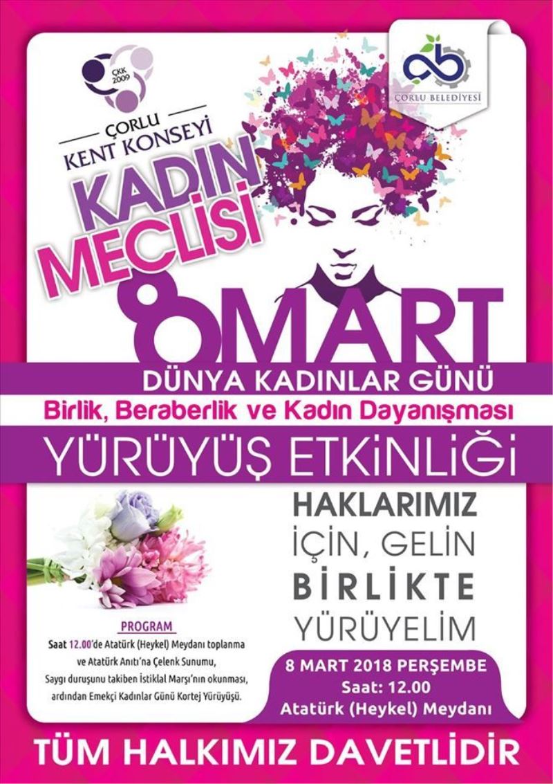 Çorlu Belediyesi ve Çorlu Kent Konseyi Kadın Meclisi öncülüğünde gerçekleştirilecek etkinlikler 8 Mart Perşembe günü saat 12:00´de Atatürk Meydanı´nda (Heykel) toplanma, anıta çelenk sunumu ve “Birlik, Beraberlik ve Kadın Dayanışması Kortej Yürüyüşü” ile başlayacak.
