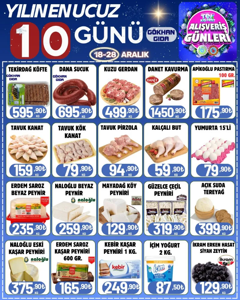 Tekirdağ Ticaret Sanayi Odası ile Tekirdağ Büyükşehir Belediyesi iş birliğinde hayata geçirilen Süleymanpaşa’da faaliyet gösteren iş yerlerimize ekonomik katkı sunmayı hedefleyen “TEK Kış Fest” (Tekirdağ Alışveriş Günleri) 13 Aralık-11 Ocak 2025 tarihlerinde çeşitli etkinlik ve işyerlerinin kendi belirlediği indirim oranlarıyla yapılarak devam etmektedir. Yerel esnafımıza katkı sağlamayı düşünülen bu organizasyonda GÖKHAN GIDA bende varım diyerek indirimli ürünlerini yayınladı.