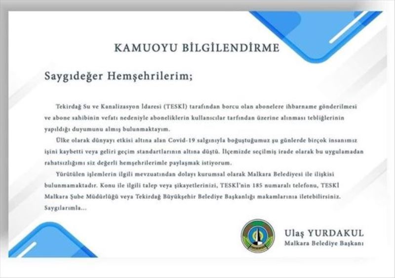 Başkan yaptığı eleştirisinde; “içinde bulunulan zorlu süreçte gönderilen ihbarnamelerin yanlış olduğunu belirtirken bu uygulamanın Malkara Belediyesi tarafından yapılmadığının altını çizerek bu konuda tek suçlunun TESKİ Yönetiminin olduğunu açıkça ifade etti